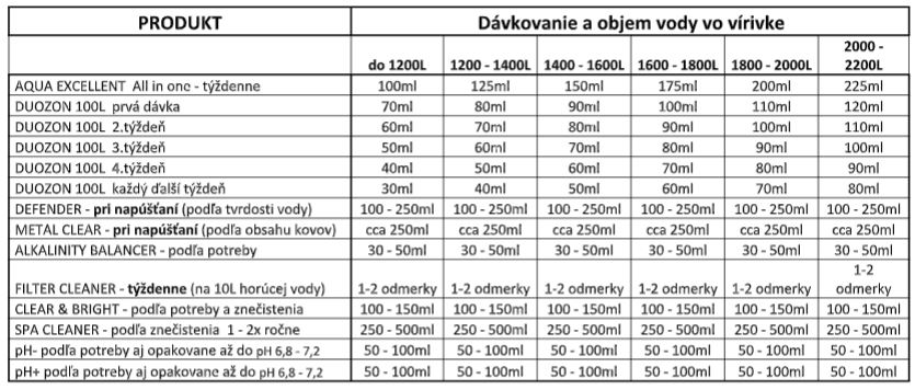 Orientačné dávkovanie v závislosti od objemu vody vo vírivke nájdete v priloženej tabuľke.